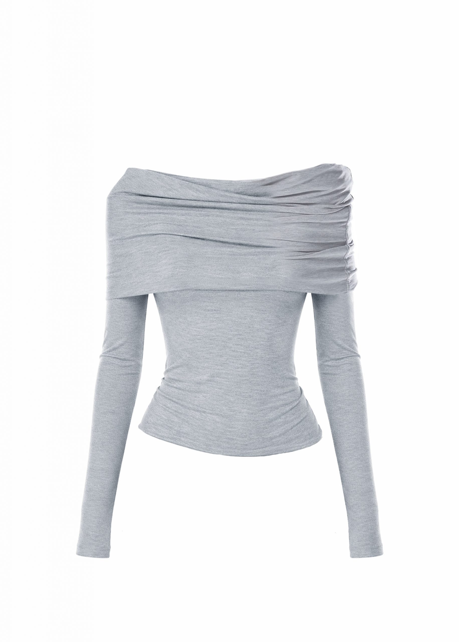 Top de punto jaspeado con escote off-shoulder multiposición y drapeado envolvente.