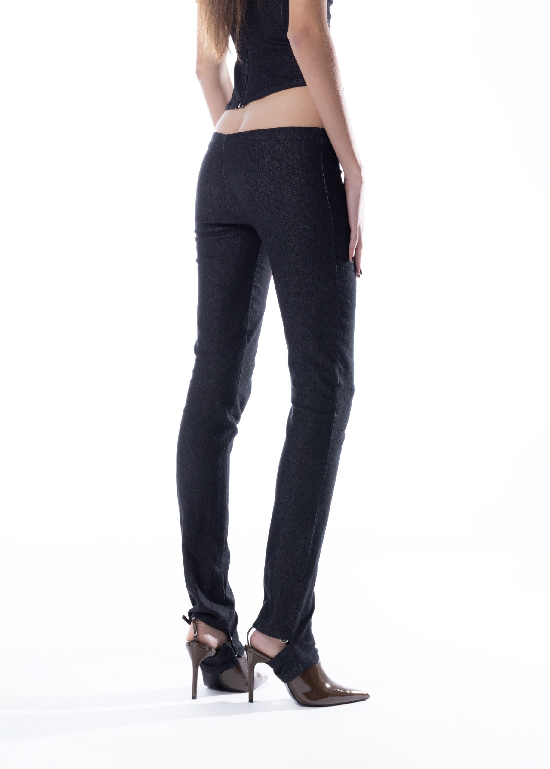 Vaqueros pitillo de tiro ultra bajo. Bajo alargado con abertura y corchetes que se ajustan a la planta del pie.